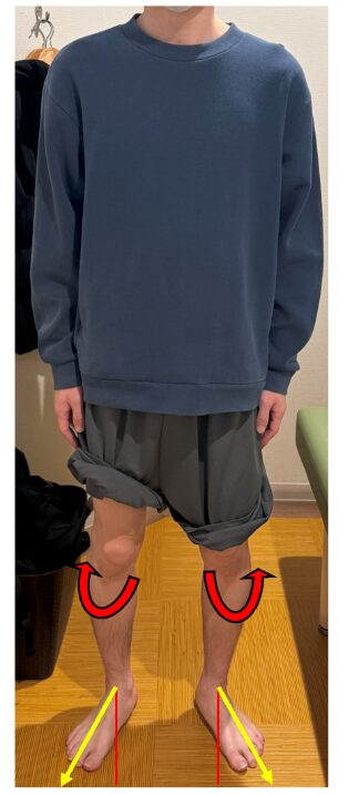 右側の正常の膝関節と比べ左の膝関節は、脛の骨が外側へねじれています。