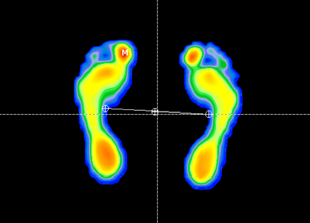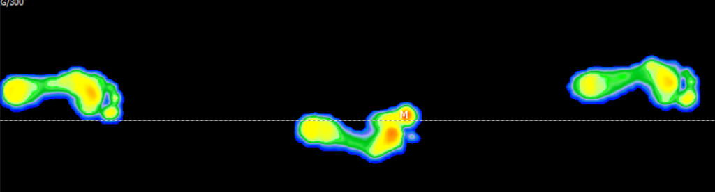 ※踵着地歩行の足圧を測定すると、踵に強い圧が加わり、足全体の緊張がみられる。