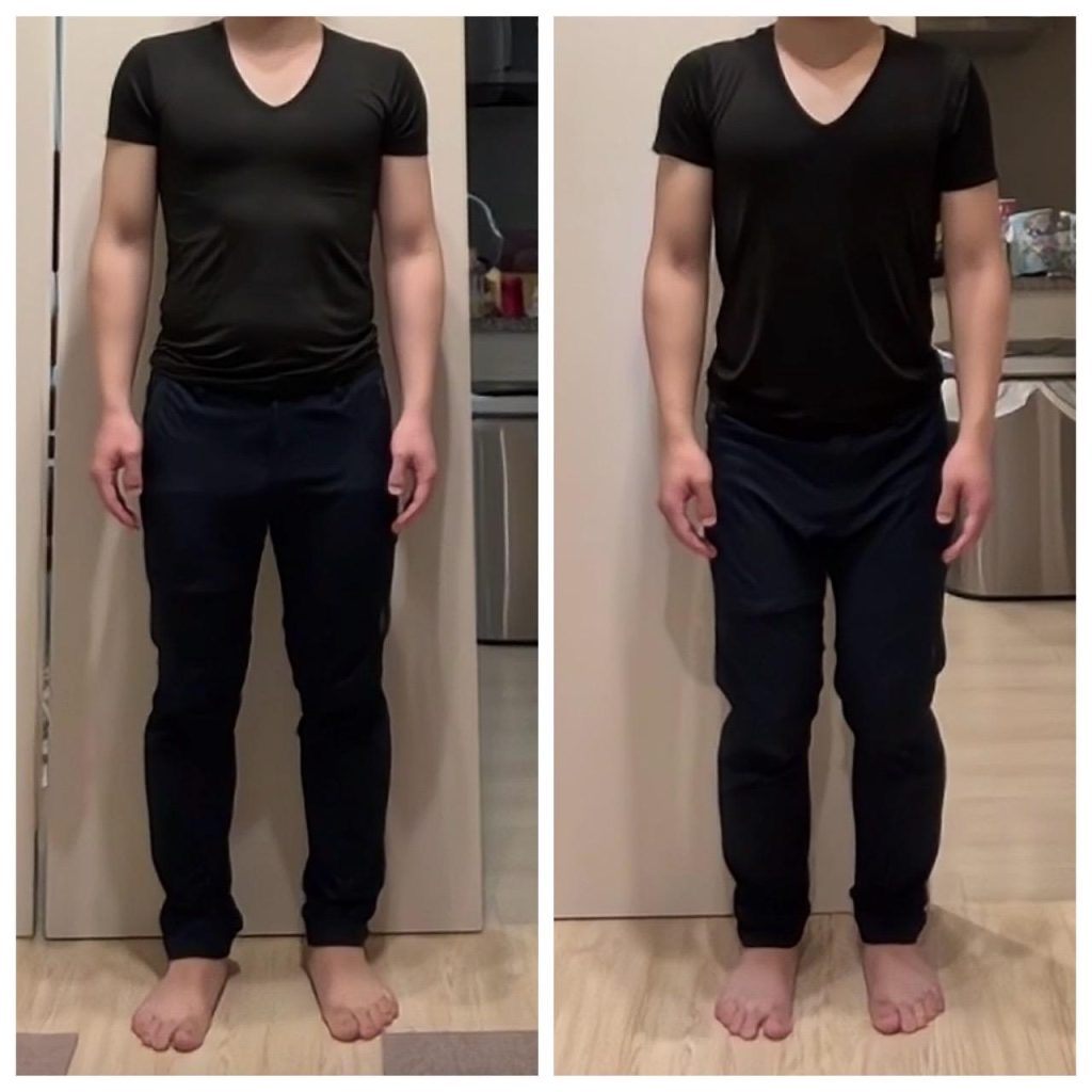 【右:胸を張る、背筋を伸ばす立ち方を矯正した結果、肩の高さが揃い、下腹も凹む】