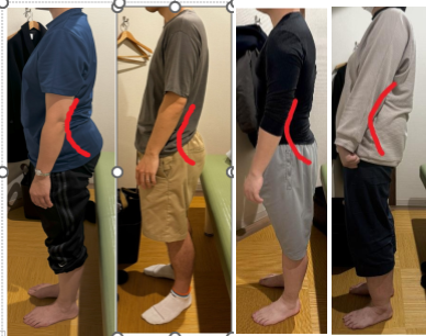 【左:胸張り癖が長期間あり、肩の高さが左右で違い、下腹部が出っ張っている】